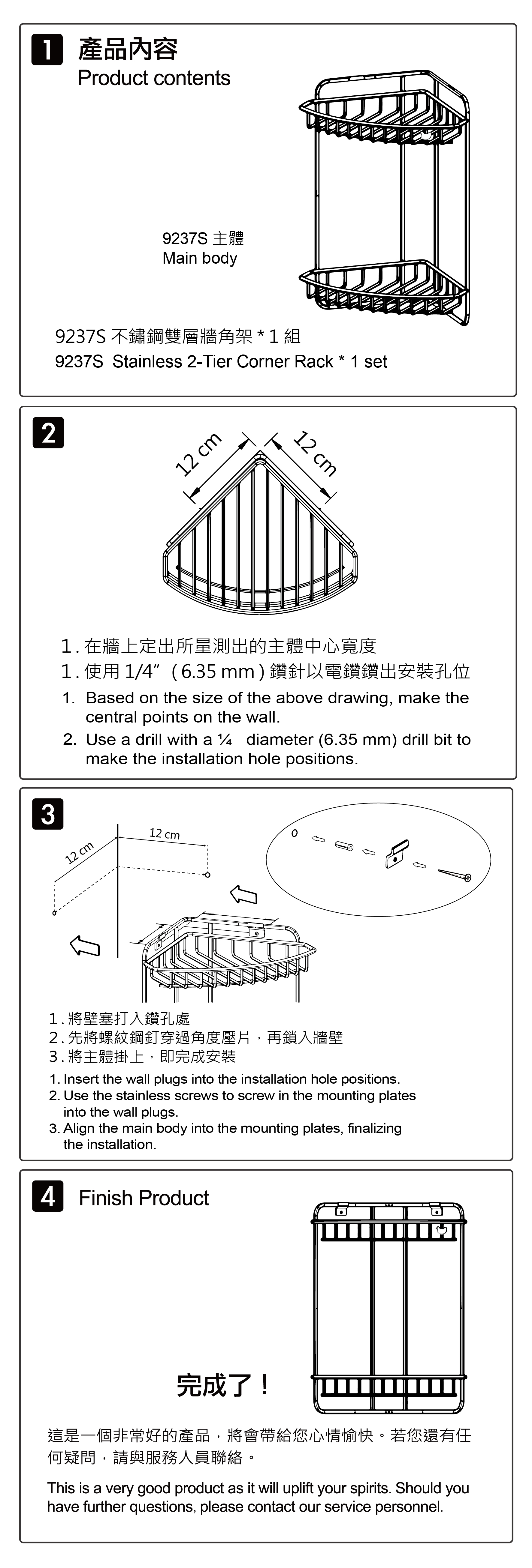 | 內部配件: | 不鏽鋼雙層牆角架 (粗線) * 1、不鏽鋼壓片 * 2、不鏽鋼螺絲 * 2、壁塞 * 2 |