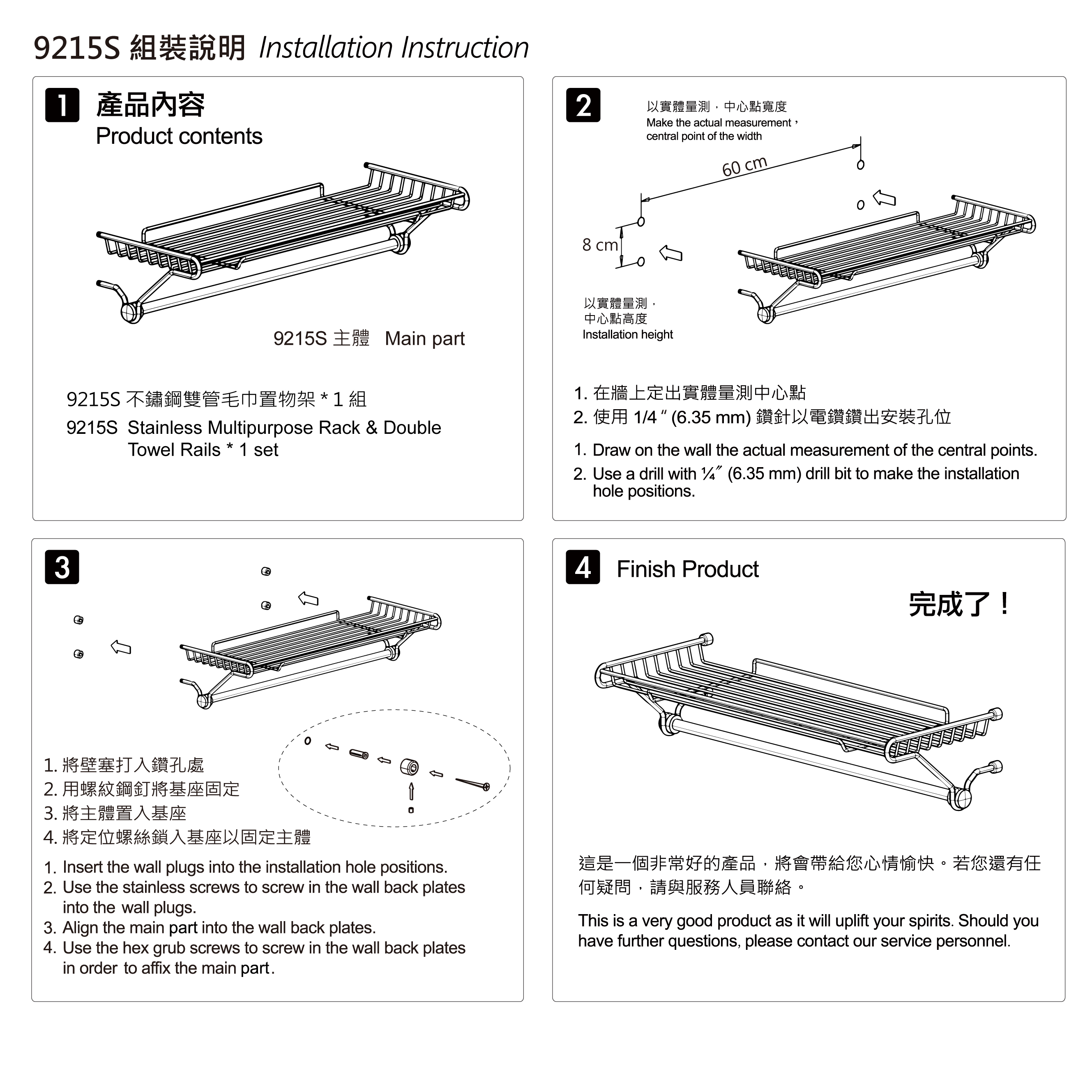 | 內部配件: | 不鏽鋼置物毛巾架 (62.8 公分) * 1 、不鏽鋼管 * 1 、 不鏽鋼接頭 * 4 、不鏽鋼螺絲 * 4 、不鏽鋼固定螺絲 * 4 、塑膠壁塞 * 4 、六角板手 * 1 |