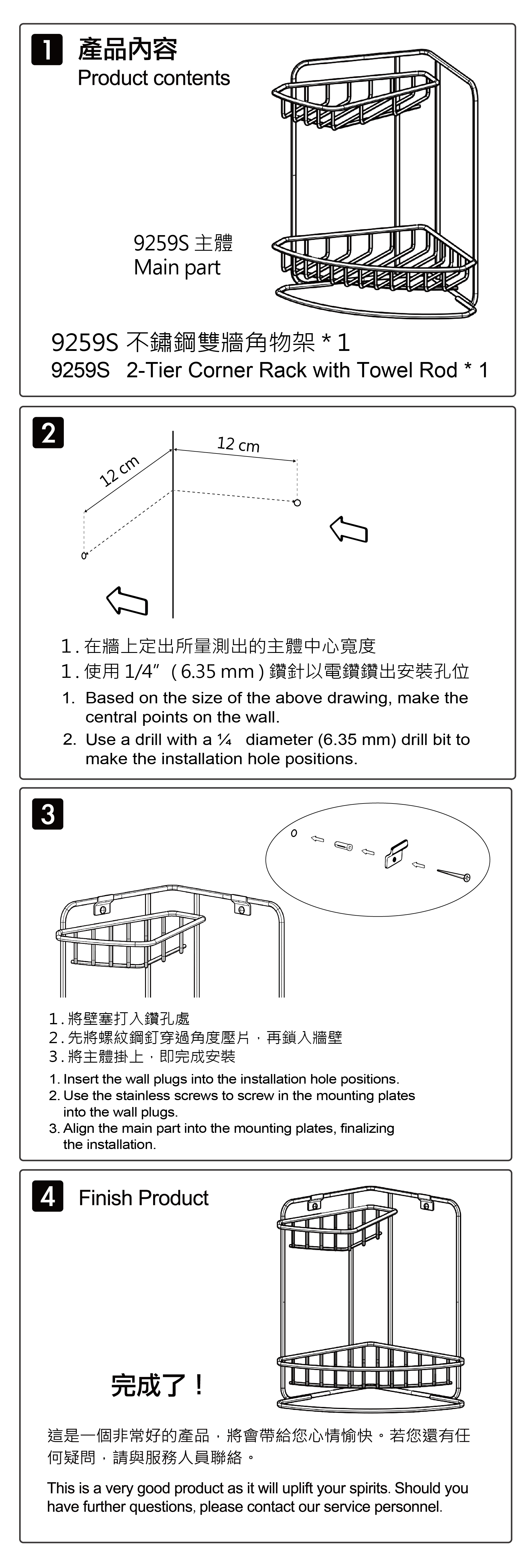 | 內部配件: | 不鏽鋼雙層牆角置物架 (含底座) * 1 、不鏽鋼壓片 * 2 、不鏽鋼螺絲 *2 、塑膠壁塞 * 2 |