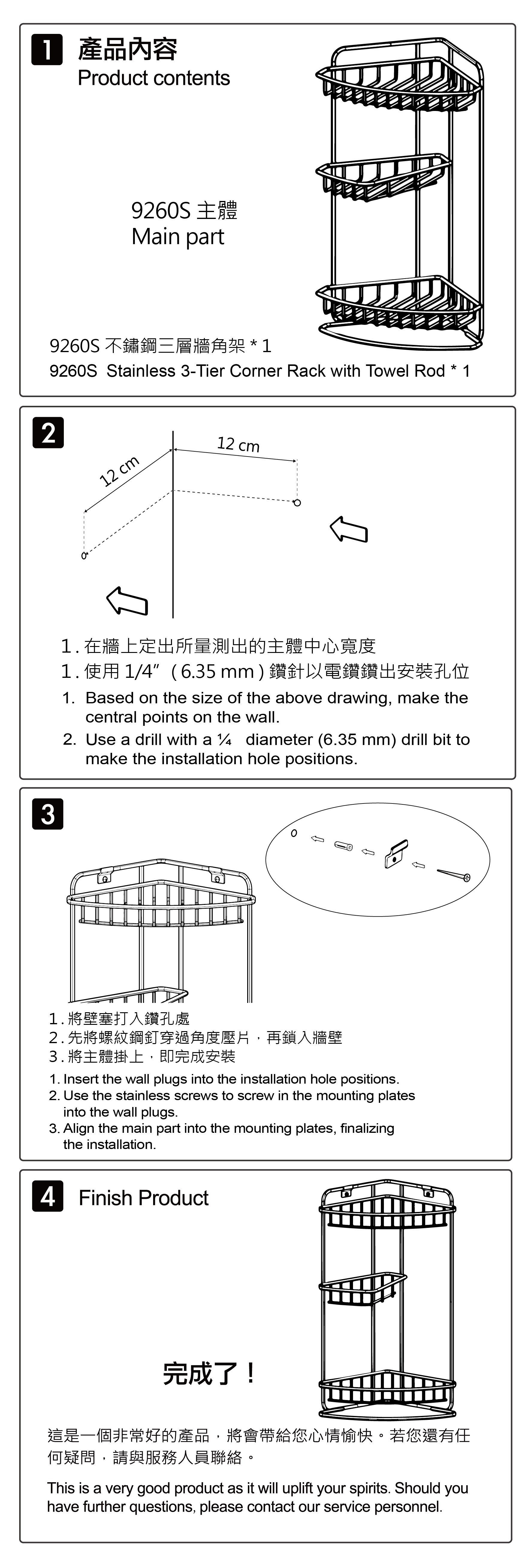 不鏽鋼雙層牆角架含底座 * 1 、不鏽鋼螺紋鋼釘 * 2 、塑膠壁塞 * 2 、不鏽鋼角度壓片 * 2