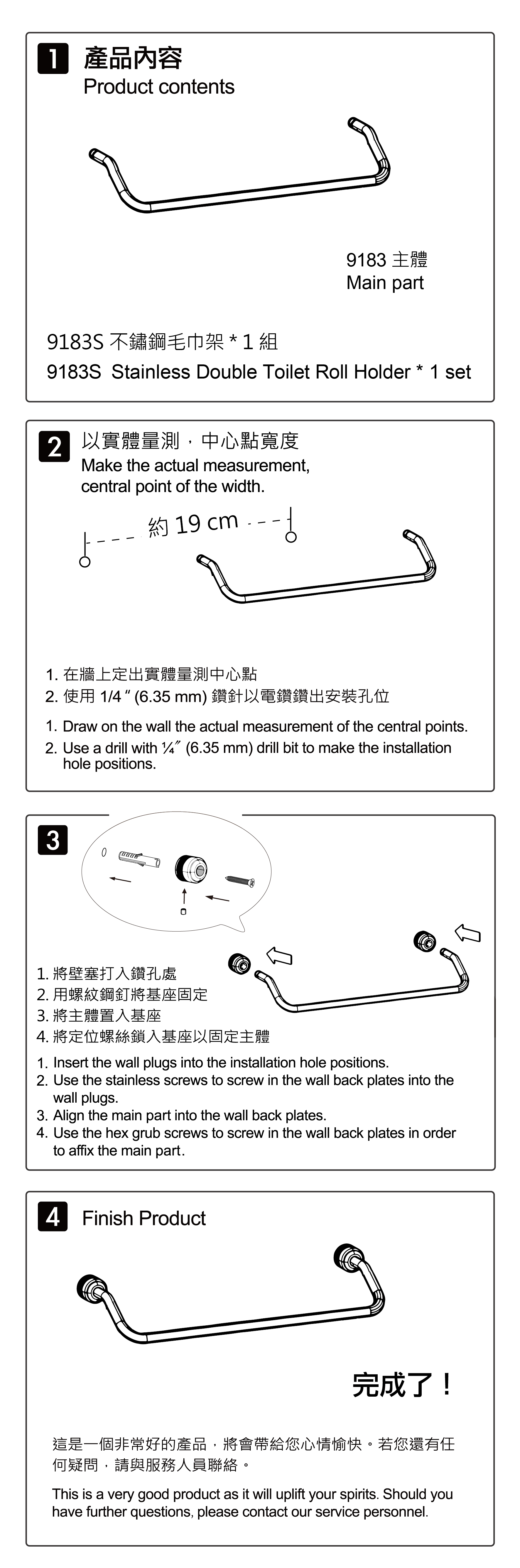| 內部配件: | 不鏽鋼毛巾架 * 1 、不鏽鋼接頭 * 2 、不鏽鋼螺絲 * 2 、不鏽鋼固定螺絲 * 2 、壁塞 * 2 、六角板手 * 1 |
