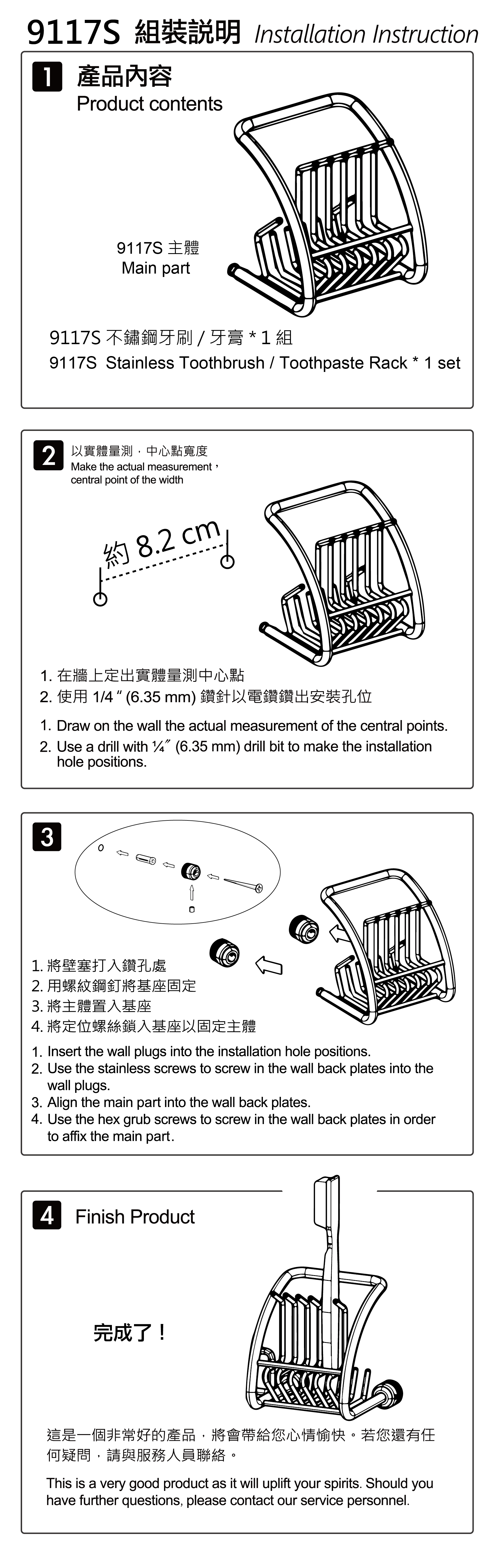 | 內部配件: | 不鏽鋼漱口杯架 * 1 、 不鏽鋼接頭 * 2 、 不鏽鋼螺絲 * 2 、 不鏽鋼固定螺絲 * 2 、 壁塞 * 2 、 六角板手 * 1 |