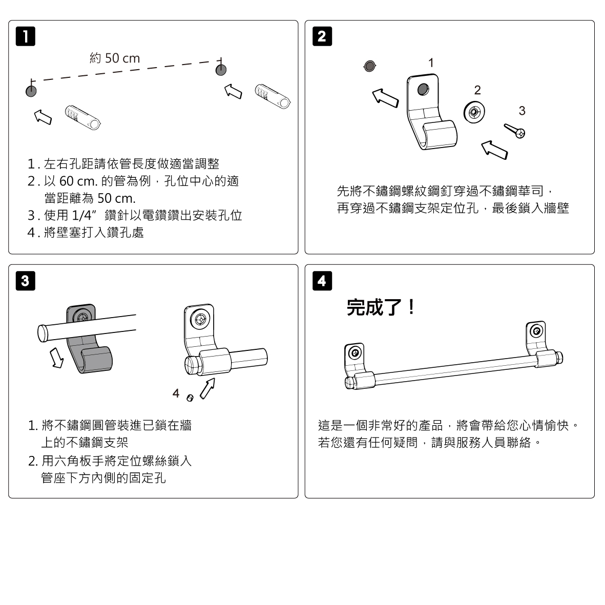| 內部配件: | 不鏽鋼支架 * 2 、 不鏽鋼 61 公分圓管 * 1 、不鏽鋼管蓋 * 2、不鏽鋼華司 * 2、不鏽螺紋鋼釘 * 2 、壁塞 * 2、六角板手 * 1 、不鏽鋼定位螺絲 * 2 |