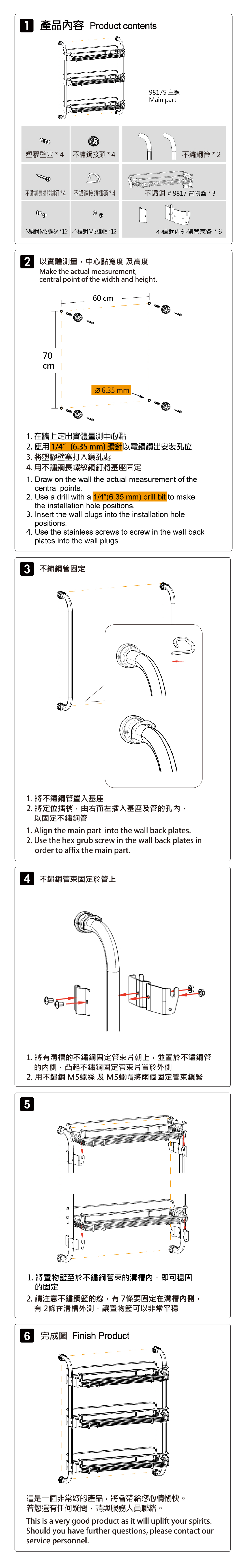 | 內部配件: | 塑膠壁塞 * 4、不鏽鋼接頭 * 4 、不鏽鋼長螺紋鋼釘 (固定牆壁) * 4、不鏽鋼管 * 2、固定管與不鏽鋼接頭插銷 * 4、不鏽鋼 M5 螺絲螺帽 各 * 12、不鏽鋼內外側管束 各 * 6、不鏽鋼置物籃 (高 7.1 * 寬 56.6 * 深 20 cm) * 3 |