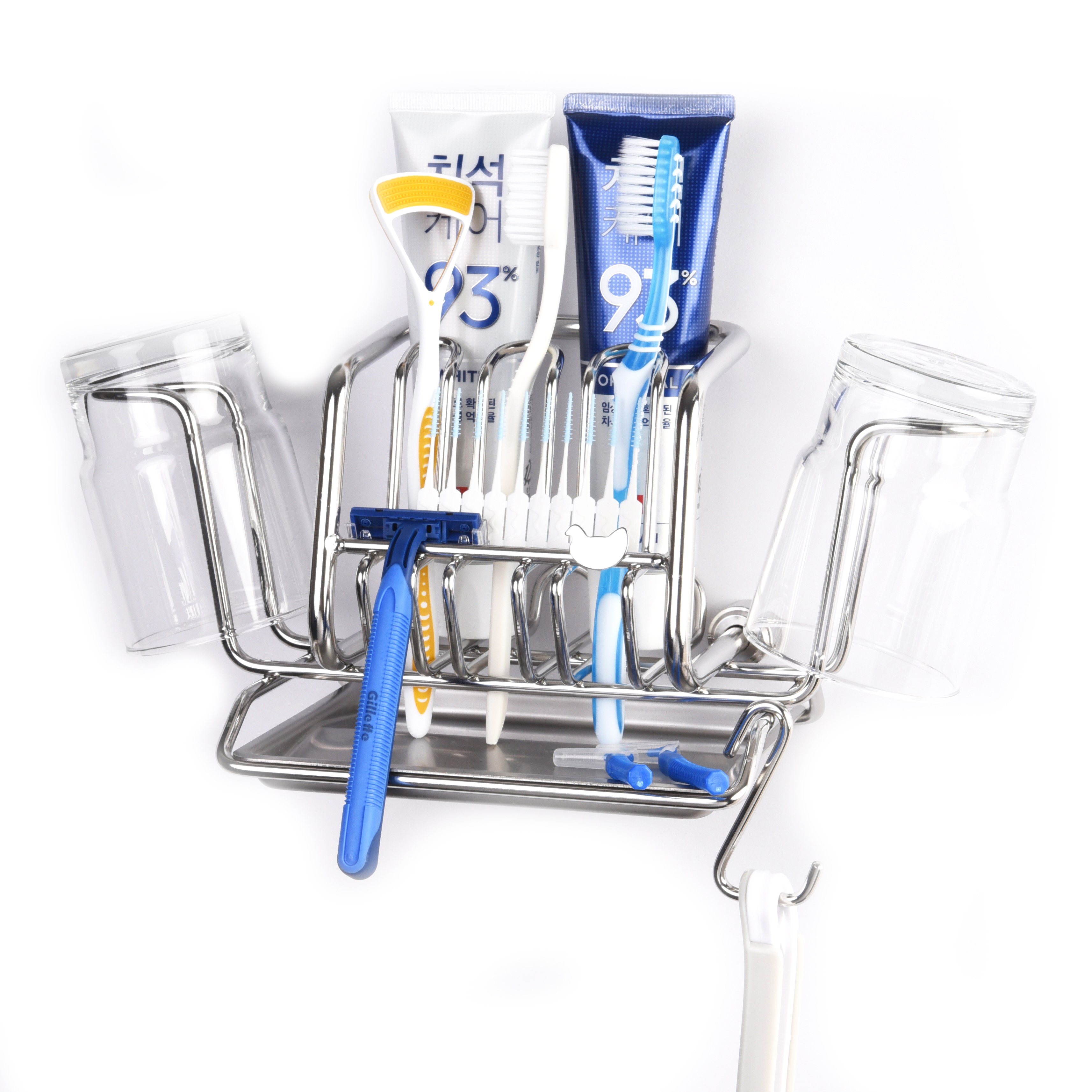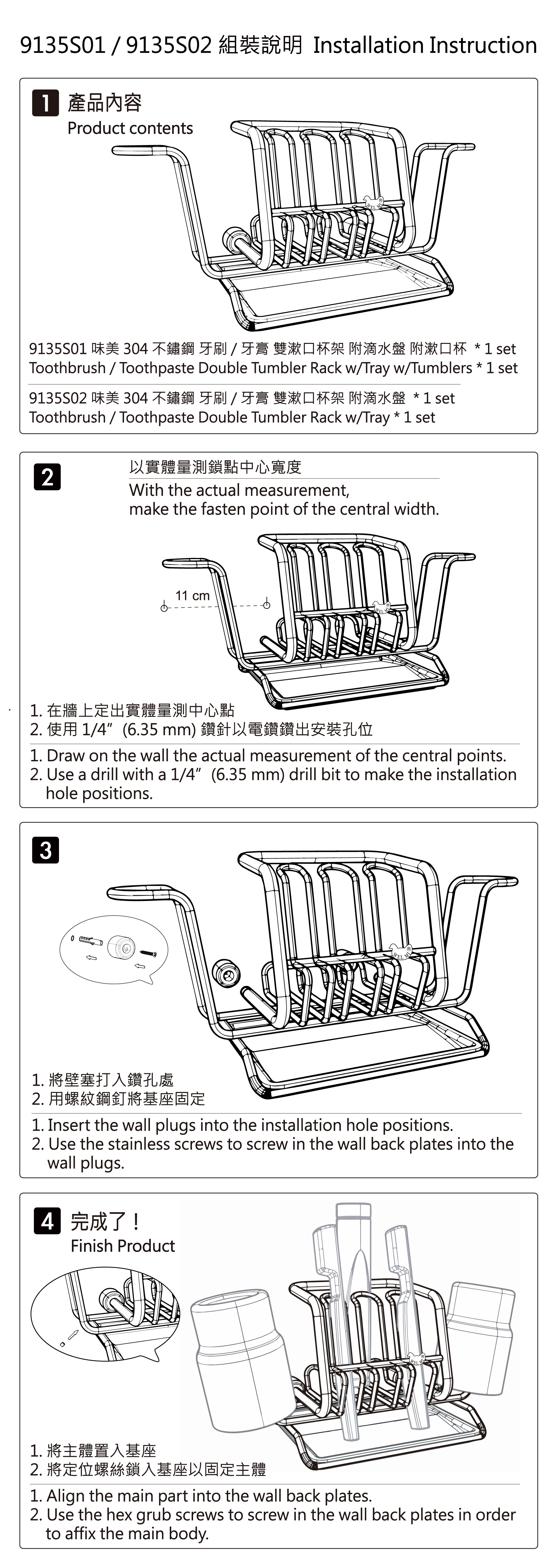 不鏽鋼牙刷 / 牙膏架 * 1 、玻璃漱口杯 * 2 、不鏽鋼滴水盤 * 1 不鏽鋼接頭 * 2 、不鏽鋼螺絲 * 2 、不鏽鋼固定螺絲 * 2 、塑膠壁塞 * 2 、六角板手 * 1