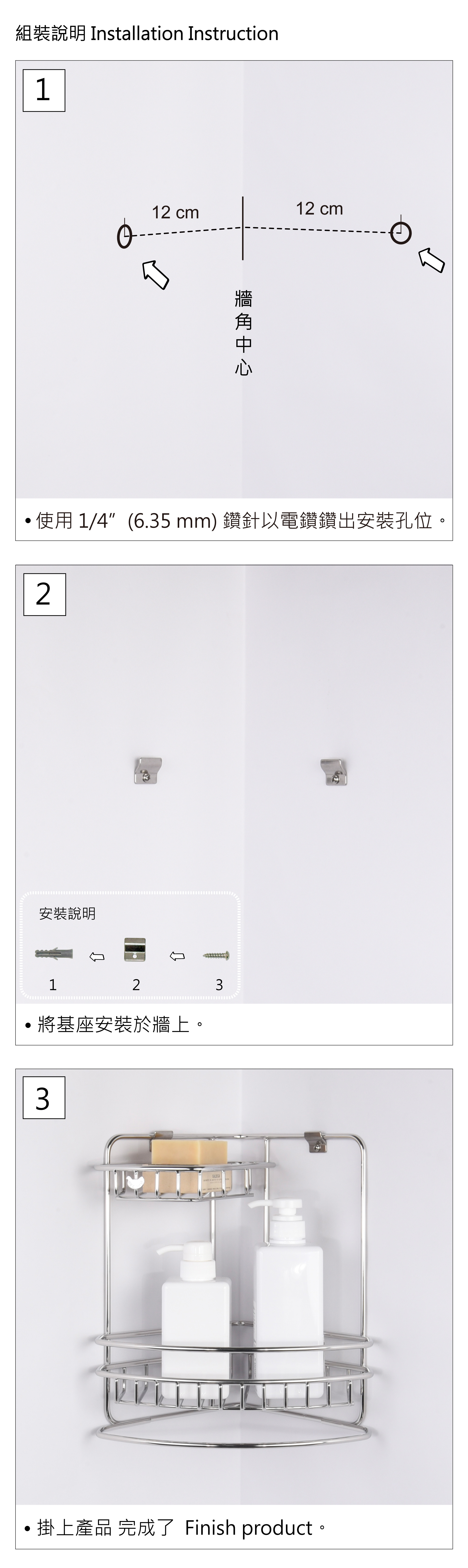 | 內部配件: | 不鏽鋼雙層牆角置物架 (含底座) * 1 、不鏽鋼壓片 * 2 、不鏽鋼螺絲 *2 、塑膠壁塞 * 2 |